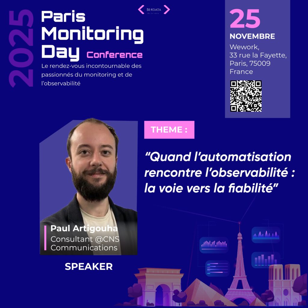 Au Paris Monitoring Day 2025, Paul partagera des retours d’expérience concrets issus de ses missions chez CNS Communications, et montrera comment ces deux approches convergent pour renforcer la fiabilité des infrastructures IT.